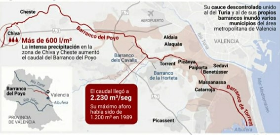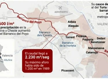 Los barrancos ya estaban desbordados. El barranco del Poyo llegó a acumular más de 2.000m3/s y la Presa de Forata (que regula las aguas del Magro) estuvo a punto del colapso. Durante esa tarde ya estaban circulando imágenes de coches arrastrados por el agua y gente intentando sobrevivir. Lo más curioso es que en las zonas de L'Horta Sud afectadas como es el caso de Paiporta, Catarroja, Benetússer o Massanassa no llovió nada. Y sin embargo, sufrieron la crecida del barranco del Poyo como si de repente el río Nilo pasase por nuestra región.