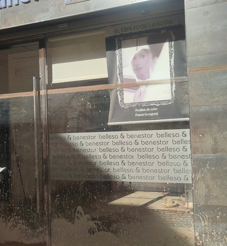 Pie de foto: negocio en Catarroja. La línea de barro muestra hasta donde llegó el agua.